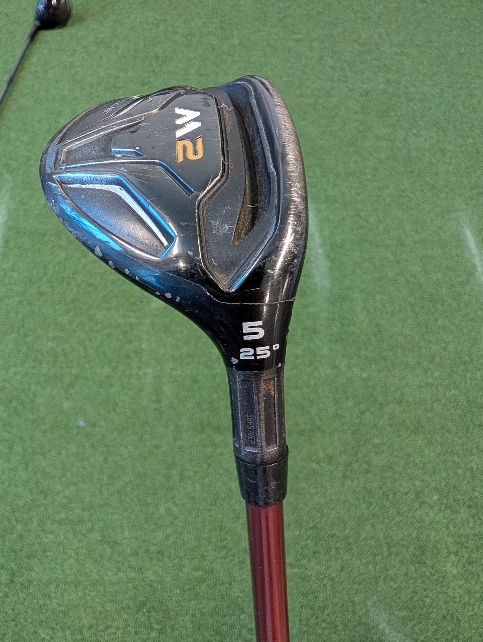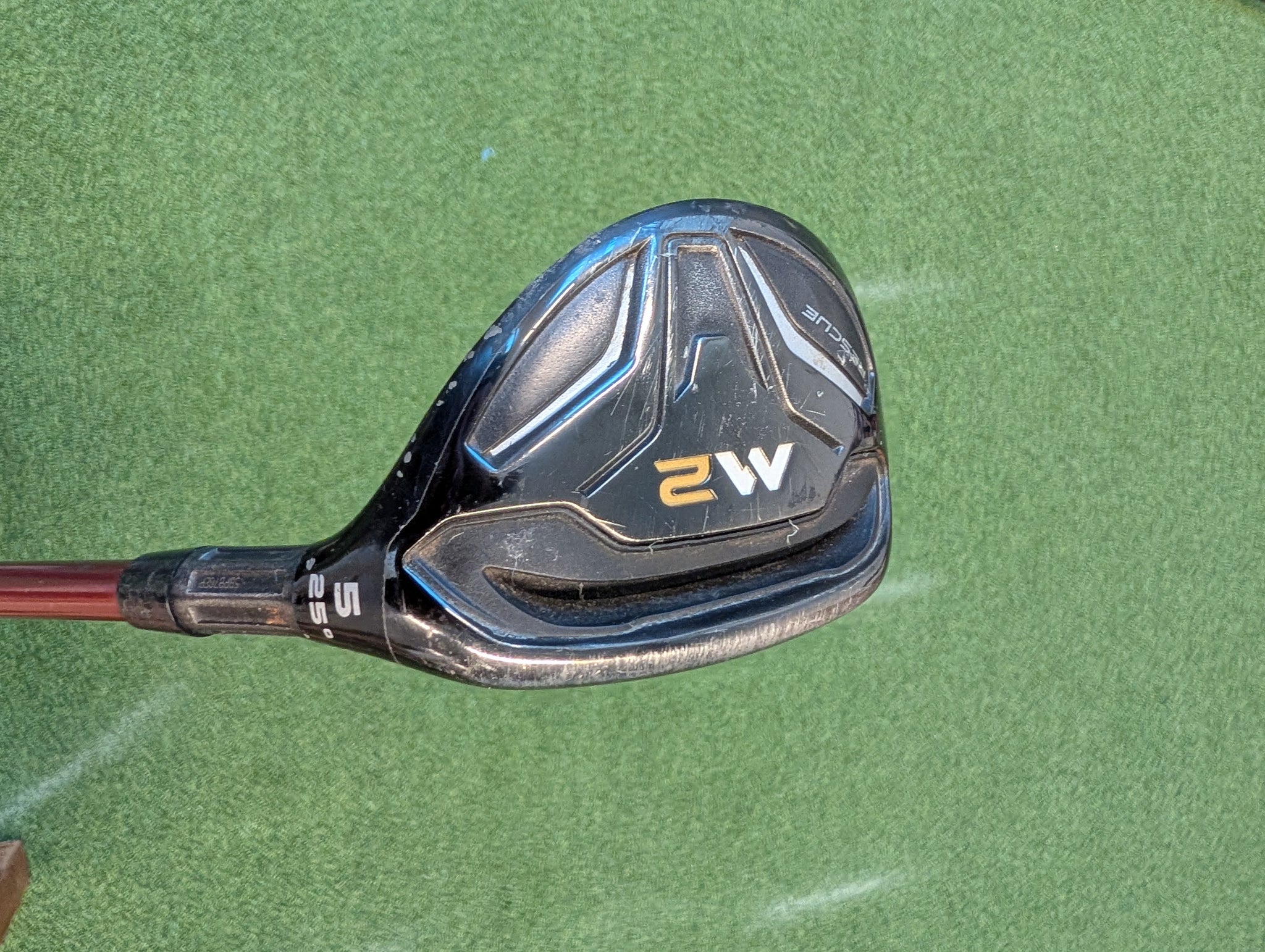 Híbrido TaylorMade M2 Rescue 2, varilla Hyb Stiff de grafito, loft 25°. Famoso por su Speed Pocket que mejora la velocidad de bola y tolerancia en impactos bajos. Condición promedio 7/10, grip estándar. Excelente opción para reemplazar hierros largos y ganar altura y distancia con facilidad.